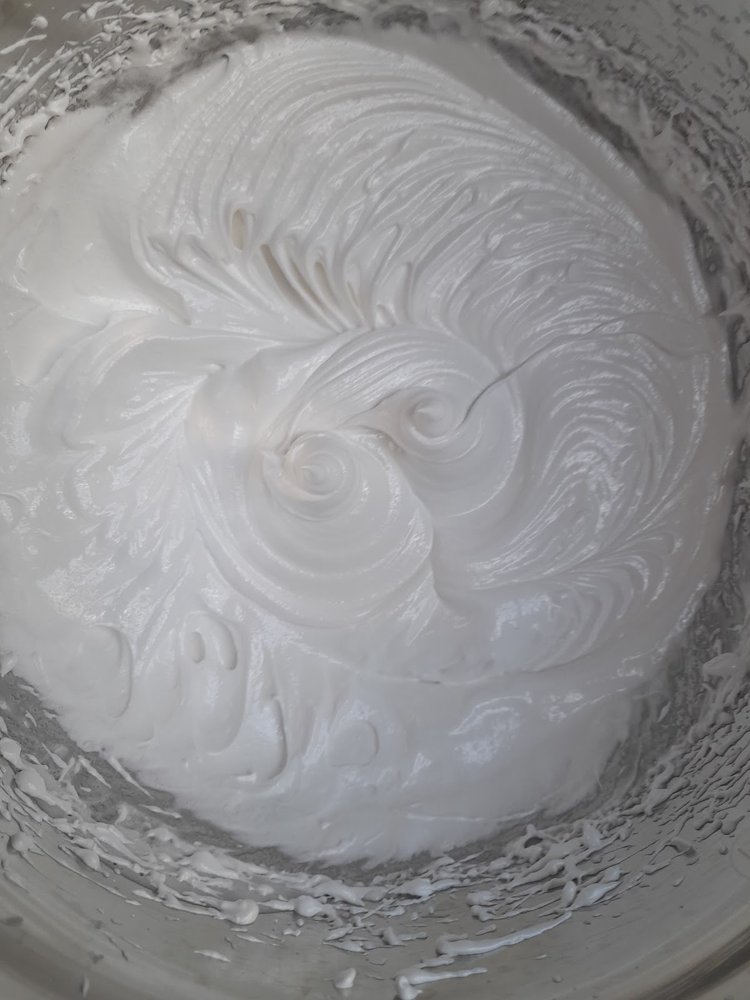 Gotowa masa białkowa jest bardzo gęsta, gładka i pięknie się błyszczy, aby uzyskać taki efekt potrzebujemy 15-20 minut ubijania białek z cukrem.