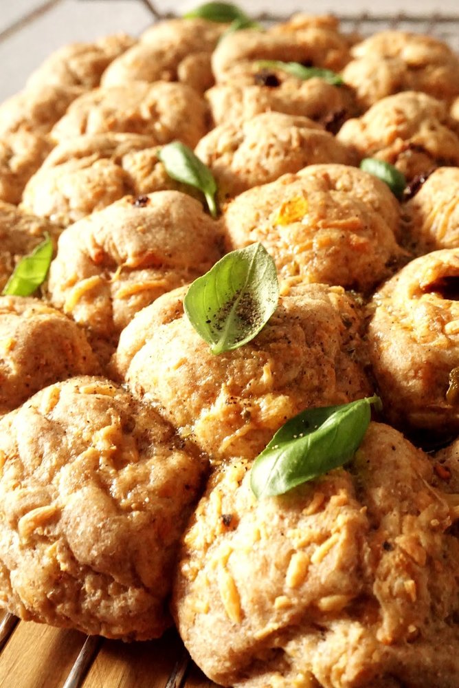 Wyrośnięte ciasto jeszcze raz wyrobić dodać do niego starty żółty ser oraz posiekane oliwki i suszone pomidory, całość porządnie wyrobić. Przygotować dowolną blachę na której zamierzacie piec chlebek, wyłożyć na niej papier do pieczenia. Od ciasta odrywać małe kawałki i formować z nich kulki wielkości orzecha włoskiego, układać na blaszce jedno obok drugiego (nie koniecznie bardzo ciasno, ciasto jeszcze trochę urośnie). Uformowany chlebek odstawić przykrywając czystą bawełnianą ściereczką w ciepłe miejsce na 30-40 minut, do podwojenia objętości ciasta.