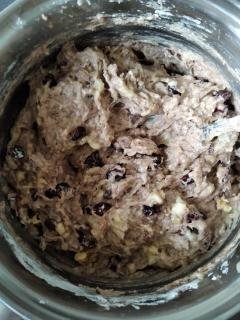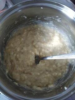 Banany obrać i umieścić w garnuszku, rozgnieść widelcem do uzyskania papki, zmieszać z roztopionym masłem. Do powstałej papki dodać wszystkie pozostałe składniki, wcześniej odłożoną mąkę z sodą dodać na koniec. Całość wymieszać widelcem lub łyżką tylko do połączenia się składników. Gotowe surowe ciasto jest dość gęste.