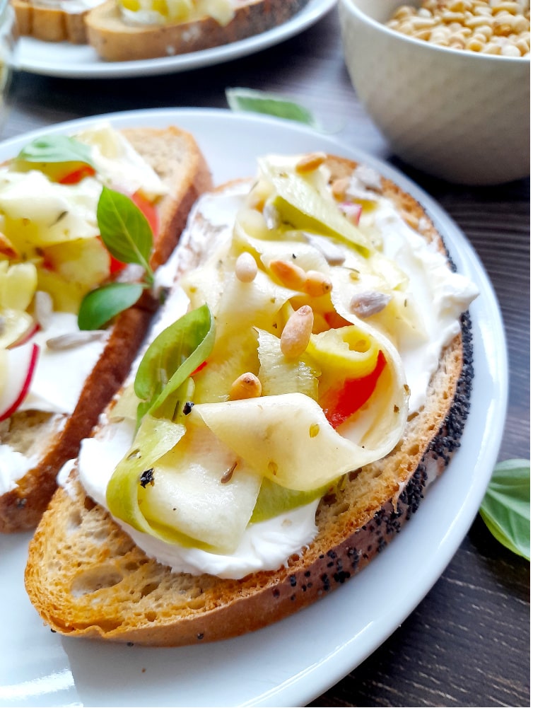Gotowe tosty posmarować kremowym serkiem, na to wyłożyć pomidory i rzodkiewki, a następnie cukinię, całośc doprawić solą i pieprzem. Udekorować nasionami słonecznika, orzeszkami pini i świeżą bazylią.