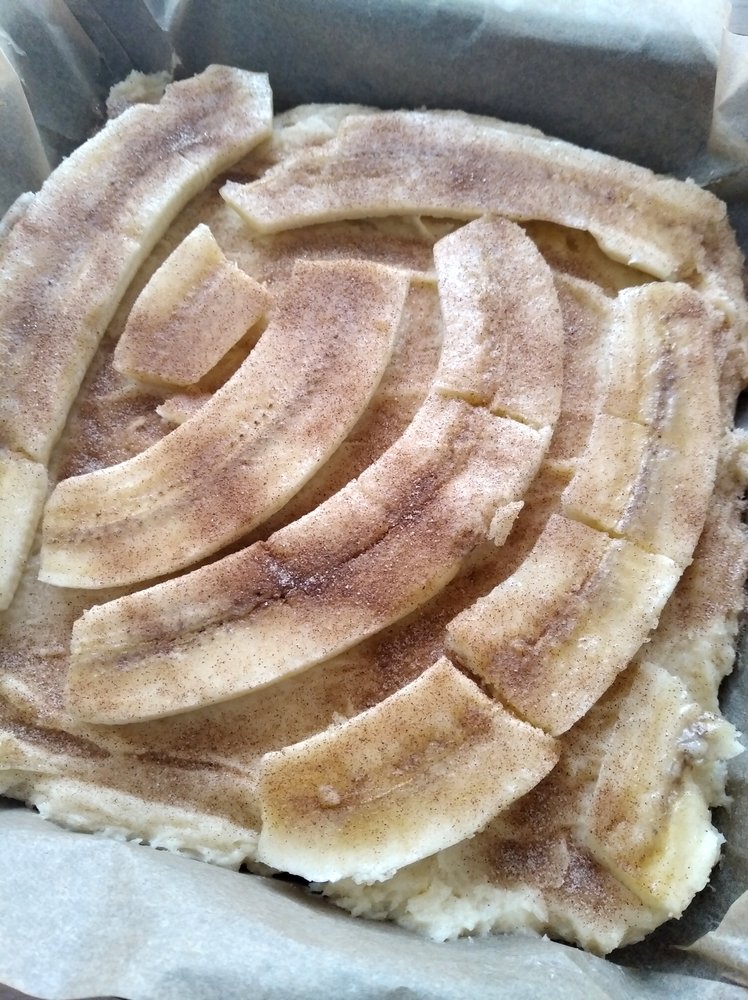 Banany obrać, przeciąć wzdłuż na pół, układać na cieście rozcięciami ku górze. Całość posypać cynamonową posypką cukrową.