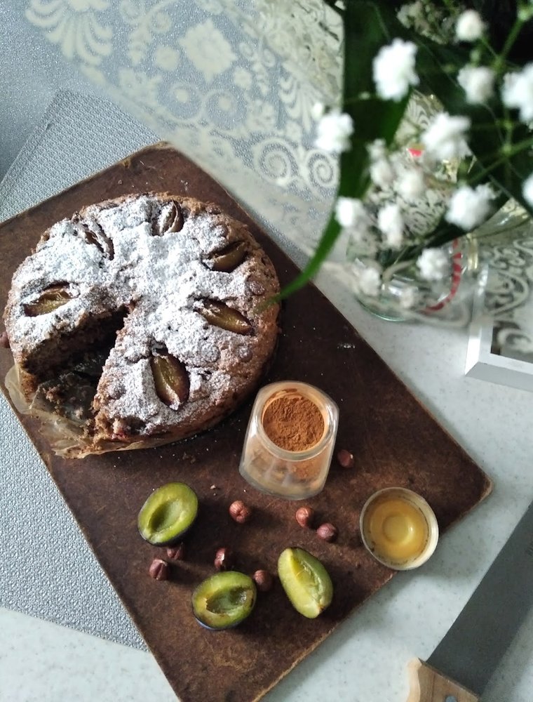 Ciasto z orzechami laskowymi, śliwkami, czekoladą i cynamonem