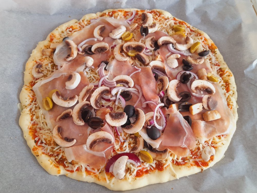 Na uformowany placek, wyłożyć niezbyt grubą warstwę sosu pomidorowego, następnie rozsypać równo ser i wyłożyć dodatki (poza rukolą, rukolę należy rozsypać na wierzchu pizzy już po jej upieczeniu, po wyjęciu z piekarnika).