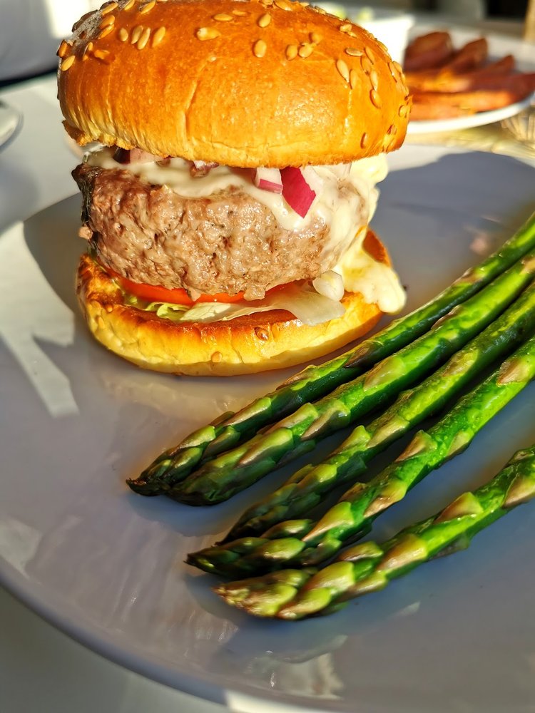 Burgera wyłożyć na duży talerz i do tego podać szparagi. Łódeczki z batatów podać na osobnym talerzu z dodatkową miseczką sosu. Oczywiście dodatki można pominąć i podawać burgera „solo”.