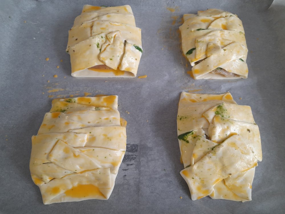 Piekarnik nagrzać do 200°C. Na blaszce wyłożyć papier do pieczenia, następnie 4 równe płaty ciasta francuskiego. Na każdy kawałek ciasta wyłożyć (na samym jego środku) po jednym filecie z nadzieniem szpinakowym. Ciasto francuskie ponacinać po obu bokach tworząc paseczki. Paseczki zwijać do środka na zakładkę. Delikatnie docisnąć/ dokleić palcami łączenia jeśli to konieczne. Niestety nie miałam możliwości zrobić zdjęcia podczas przygotowywania potrawy, ale na załączonych zdjęciach prezentuje to na papierze do pieczenia 🙂