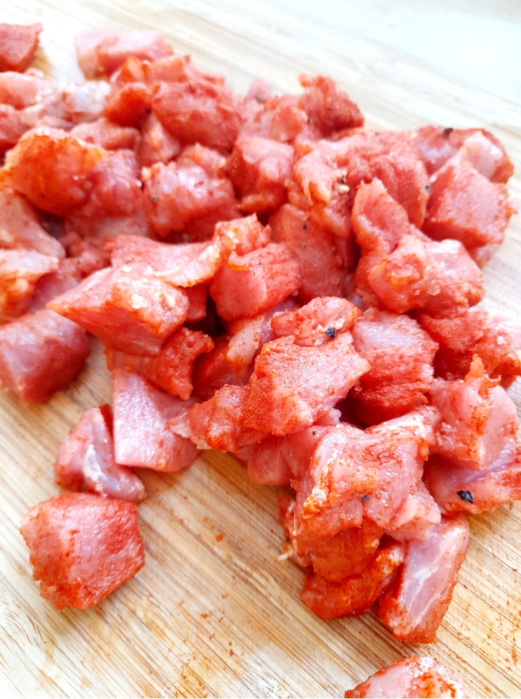 Polędwicę wieprzową pokroić na mniejsze kawałeczki (taka wielkość żeby była dla Was odpowiednia), u mnie to jest około 2 cm x 2 cm. dodać czosnek przeciśnięty przez praskę, doprawić solą, pieprzem i słodką papryką, wszystko dokładnie wymieszać.