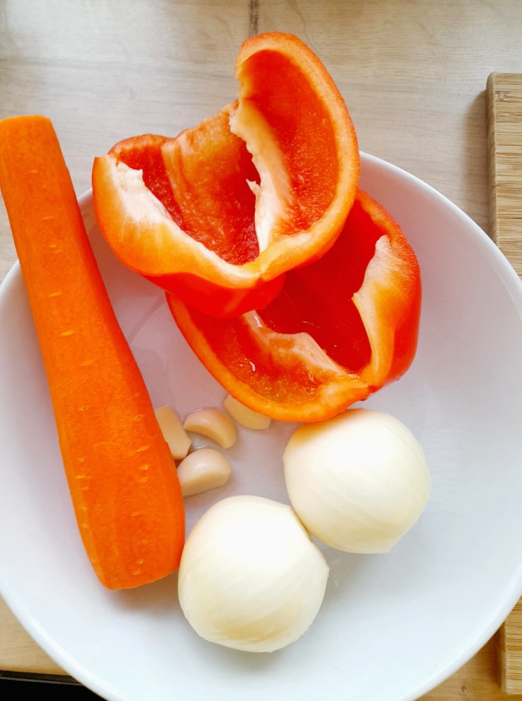 Marchewkę obrać, paprykę umyć i oczyścić z gniazda nasiennego, cebulę i czosnek obrać.