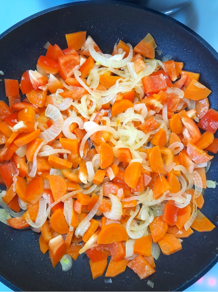 Na patelni rozgrzać 2-3 łyżki tłuszczu. Cebulę pokroić w kostkę lub piórka (wedle uznania), smażyć 10 minut. Po tym czasie dodać pokrojoną w kostkę marchewkę, smażyć kolejne 15 minut, na koniec dodać pokrojoną w kostkę paprykę i smażyć jeszcze 10 minut. Podczas podsmażania warzyw należy je od czasu do czasu mieszać, a moc palnika powinna być ustawiona na średnią.