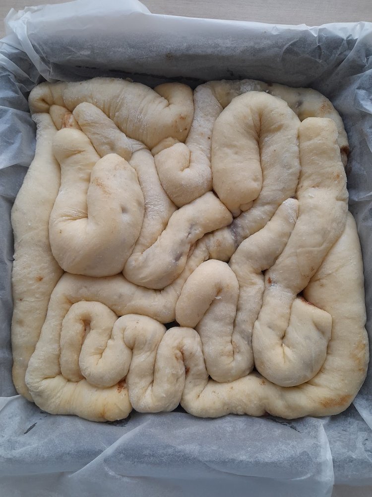 Rozwałkowane ciasto posmarować masłem, a następnie posypać cynamonowym cukrem. Kroić nożem na paski o grubości około 3,5 cm. Zrolować pocięte paski do środka wzdłuż dłuższego brzegu, łączenie rulonu układać dołem do formy, zwijać układając w formie, formować w kształt poskręcanych jelit. Przykryć bawełnianą ściereczką i ostawić w ciepłe miejsce do podwojenia się objętości bułeczek.