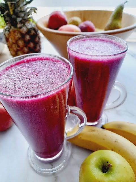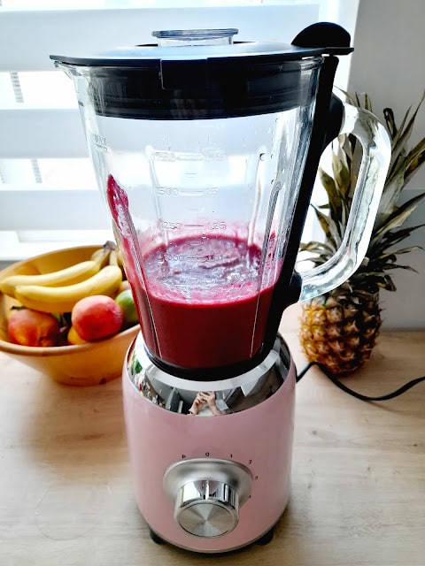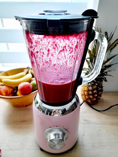 Ten koktajl ma przepiękny kolor i sporo witamin, antocyjanów i przeciwutleniaczy. Do jego przygotowania zainspirował mnie przepis z kalendarza, zwłaszcza że buraczki i sporo owoców goszczą u nas w domu często. Koktajl jest na prawdę pyszny i nawet mój dwu latek za nim przepada.