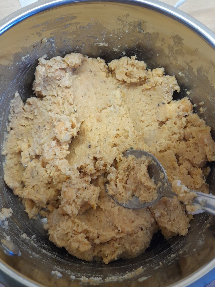 Cieciorkę przepłukać na sitku z zalewy, dodać uprzednio podsmażoną cebulkę oraz czosnek i całość zmiksować blenderem, do otrzymania gładkiej masy. Następnie dodać jajka, przyprawy i bułkę tartą, wszystko dobrze wymieszać.