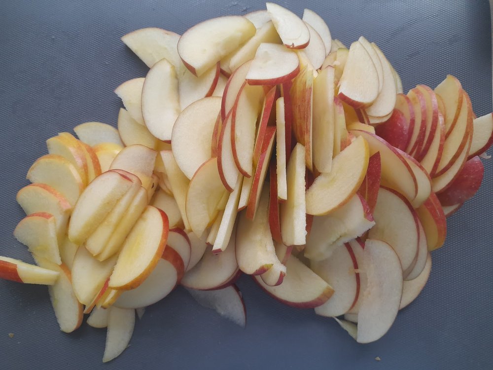 Jabłka dokładnie umyć – nie obierać. Usunąć gniazda nasienne, podzielić na ćwiartki. Wszystkie kawałeczki pokroić na cienkie plasterki (maksymalnie 2 mm, tak jak na zdjęciu). Ja robiłam to nożem, ale jeśli posiadasz mandolinę do warzyw, to polecam użyć – znacznie ułatwi to zadanie.