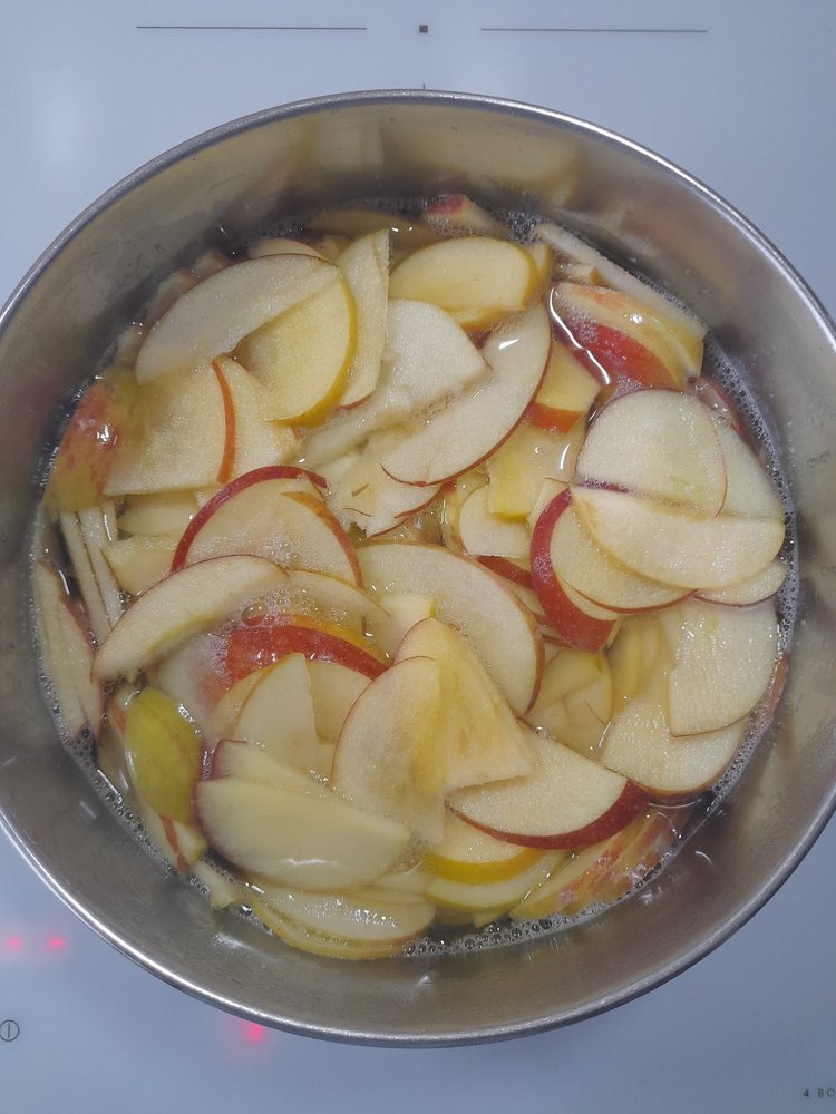 Pokrojone plasterki dodać do gotującego się syropu i całość gotować około 2 minuty. Gotowe plasterki jabłek powinny być bardzo plastyczne, miękkie, jednak nie powinny się rozpadać. Gotowe plasterki odcedzić, wystudzić.
