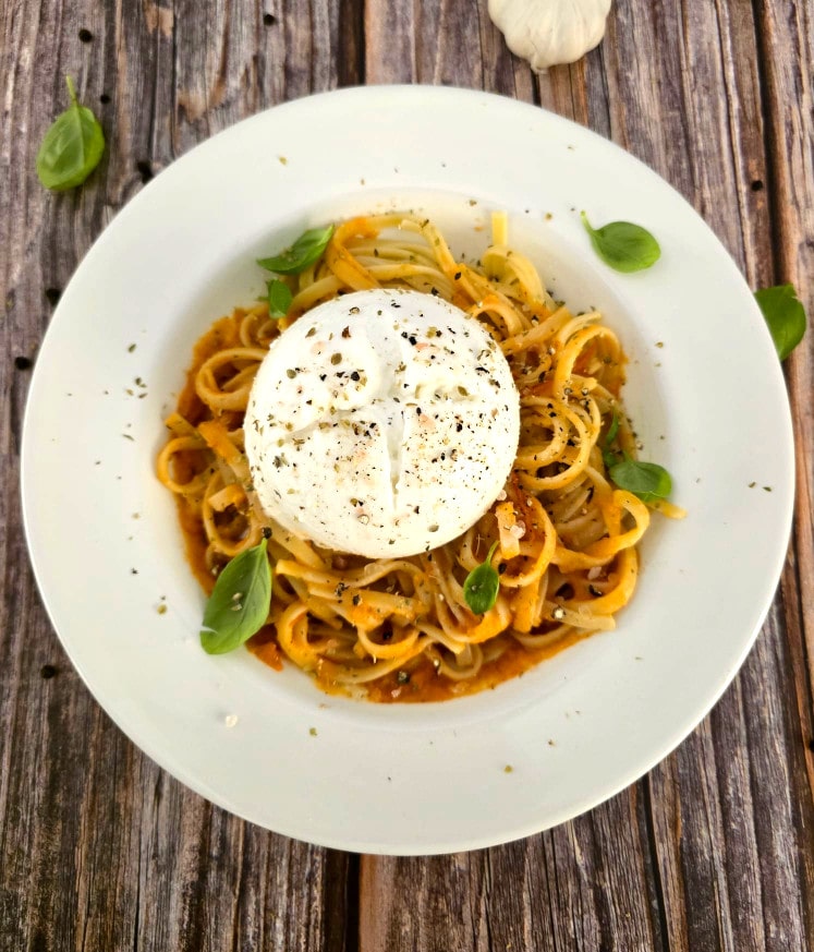 Ugotowany makaron wymieszać z sosem, przełożyć na talerze. Na wierzchu ułożyć burratę (naciąć od góry ostrym nożem, jak na zdjęciu). Udekorować świeżo mielonym pieprzem, solą oraz bazylią.