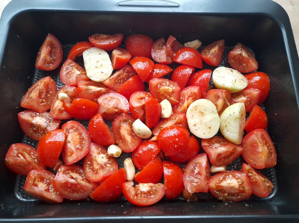 Pomidory umyć, pokroić na ćwiartki. Cebulę obrać przekroić na pół. Główkę czosnku ściąć z góry, w taki sposób aby odsłonić ząbki lub obrać każdy ząbek z osobna (ja obierałam ząbki).