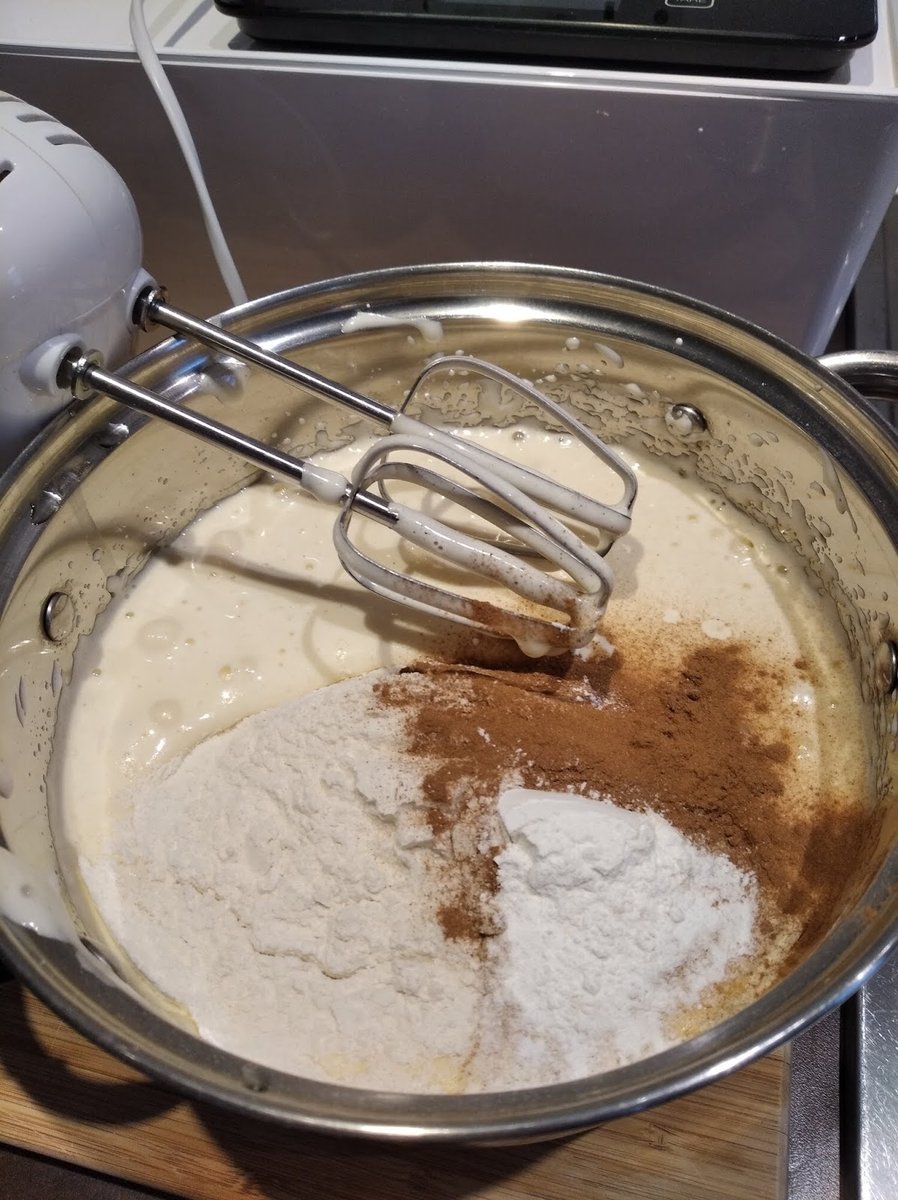 Wsypać suche składniki: mąkę, cynamon, przyprawę do piernika i proszek do pieczenia, lekko wymieszać łyżką do połączenia składników.