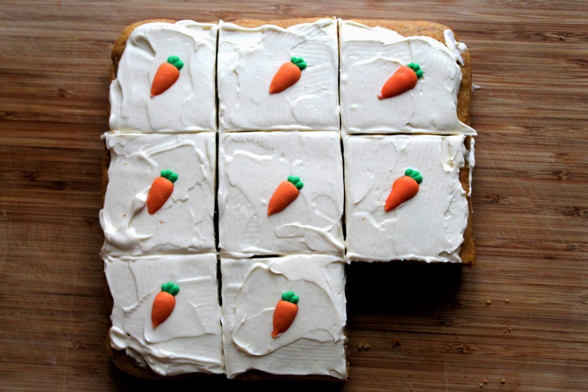 Na zimne ciasto wyłożyć równomiernie krem i udekorować cukrowymi marchewkami. Przechowywać w lodówce.