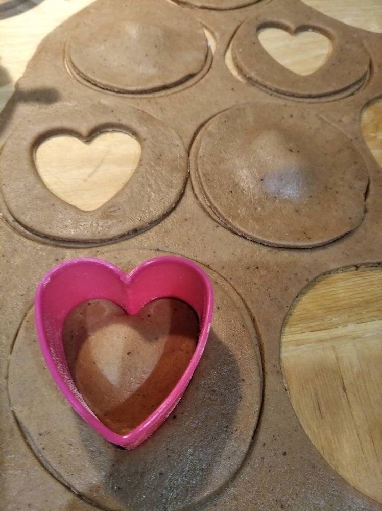 Po upływie tego czasu, ciasto wyjąć z lodówki, odrywać lub odkrawać nożem kawałki ciasta, rozwałkować na oprószonej mąką stolnicy na 3 mm. Z ciasta wycinać większe koła (u mnie koła o średnicy 10 cm). Na środku każdego koła położyć małą łyżeczkę nadzienia (najlepsza będzie twarda marmolada o dowolnym smaku, u mnie różana), ilość nadzienia zależy od wielkości foremki. Każde wykrojone koło przykryć innym wykrojonym kawałkiem ciasta. Wykrawać pierniczki dowolnym kształtem foremki (mniejszy od wielkości koła). Boki pierniczków delikatnie docisnąć aby się skleiły.