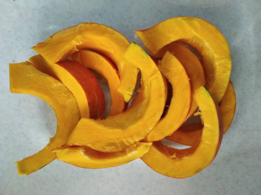 Dynię umyć i osuszyć, przekroić na pół, dużą łyżką wydrążyć środek z nasionami, pokroić na mniejsze plastry.