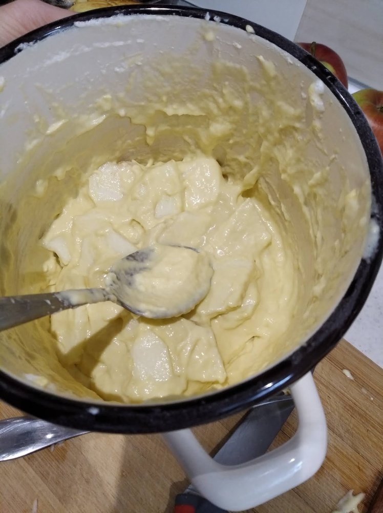 Jabłka dokładnie umyć, osuszyć i obrać, przekroić na pół, a następnie pokroić na plasterki o szerokości 2-3 mm lub grubsze, jeśli takie lubicie. Pokrojone kawałki jabłek dodać do ciasta, całość wymieszać.
