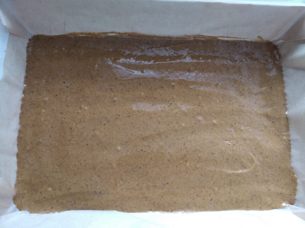Prostokątną blachę o wymiarach 38 cm x 26 cm wysmarować masłem i dokładnie wyłożyć papierem do pieczenia. Posmarowanie blachy masłem jest dość istotne, ponieważ ułatwi przełożenie ciasta na papier (papier nie będzie się ruszał po blaszce). Na tak przygotowaną formę z papierem wyłożyć ciasto, wyrównać.