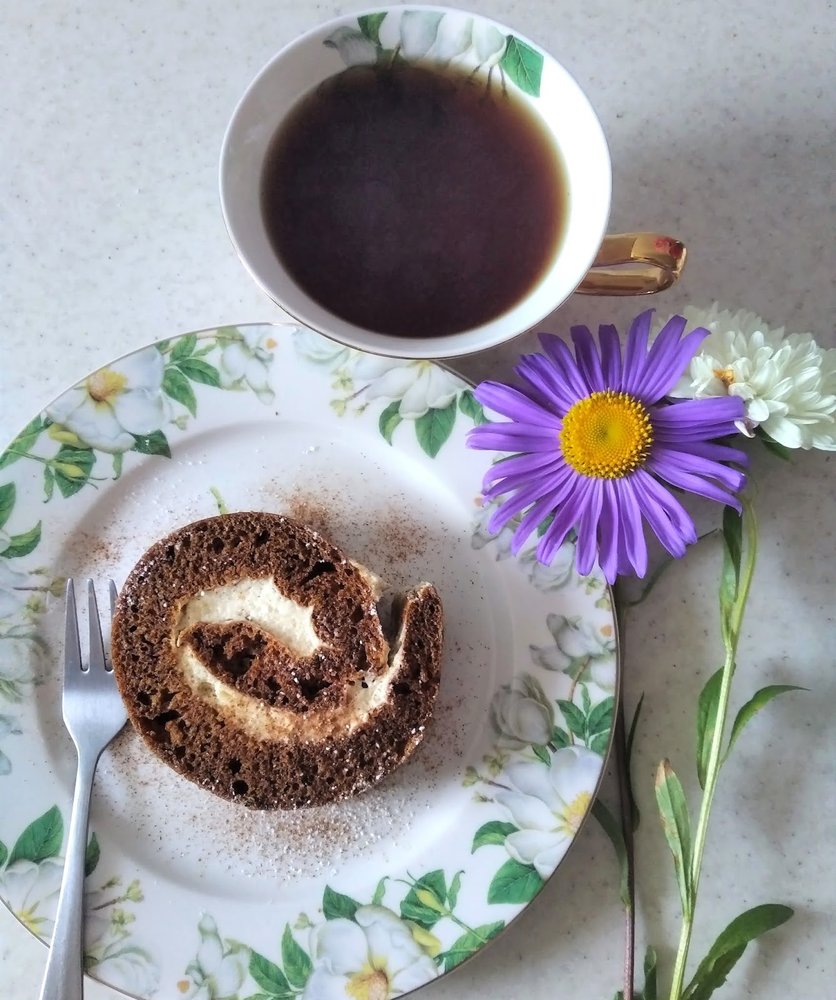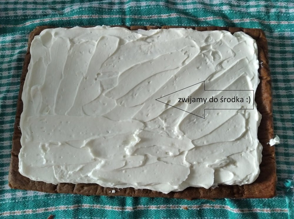 Wystudzoną roladę rozwinąć, równo rozłożyć krem na całej powierzchni ciasta, zwinąć w miarę możliwości dość ciasno z kremem. Gotową roladę przełożyć do lodówki (ja zawinęłam ją dodatkowo w ściereczkę i w takiej formie odłożyłam do lodówki na kilka godzin).