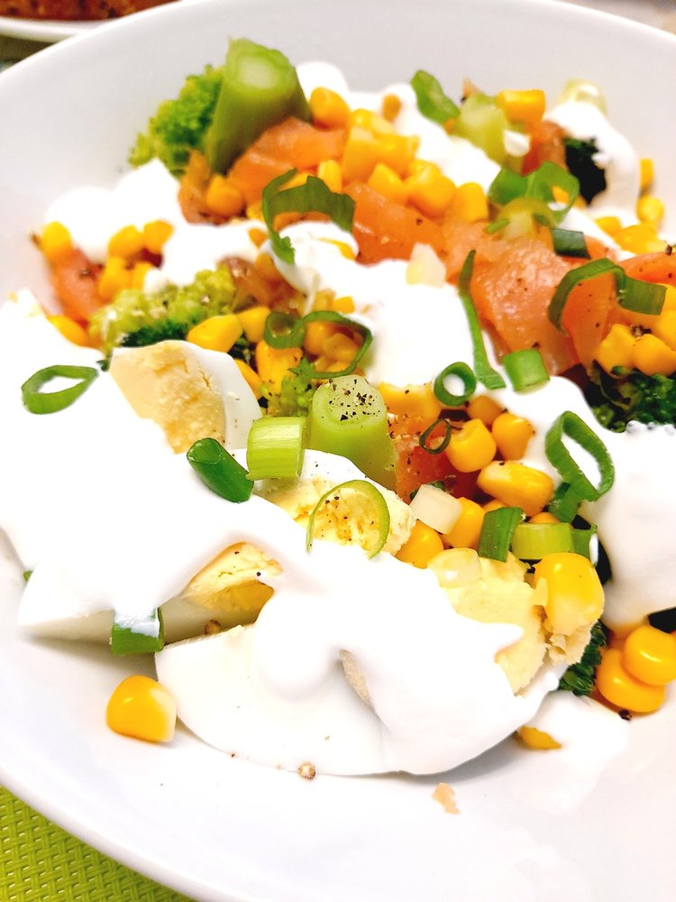 Ugotowany brokuł rozłożyć na dwa talerze, jajka obrać, pokroić w ćwiartki, rozłożyć na dwie porcje. Łososia pokroić w kostkę, dodać do każdej porcji Kukurydzę odsączyć z zalewy, przepłukać pod bieżącą wodą, dodać po równo do reszty składników. Całość polać przygotowanym sosem (jogurt + majonez),na wierzch posypać szczypiorek. Dodać sól i pieprz do smaku.