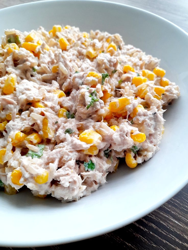 Prosta, domowa sałatka z tuńczykiem, ryżem i kukurydzą. Smaczna do zjedzenia z pieczywem oraz bez niego. Z podanych składników wychodzi duży talerz sałatki.