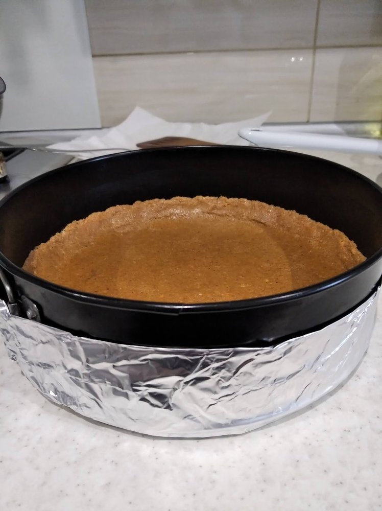 Tortownicę o średnicy 23 cm wyłożyć papierem do pieczenia (tylko jej dno). Na papier wysypać pokruszone ciasteczka, dokładnie wklepać w dno i boki formy, najlepiej do połowy wysokości formy. Schłodzić w lodówce przez minimum 30 minut.