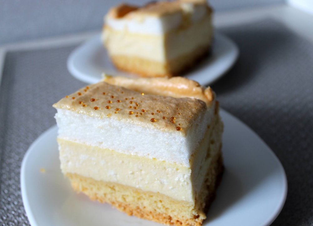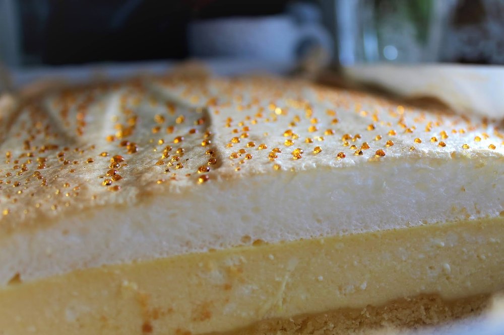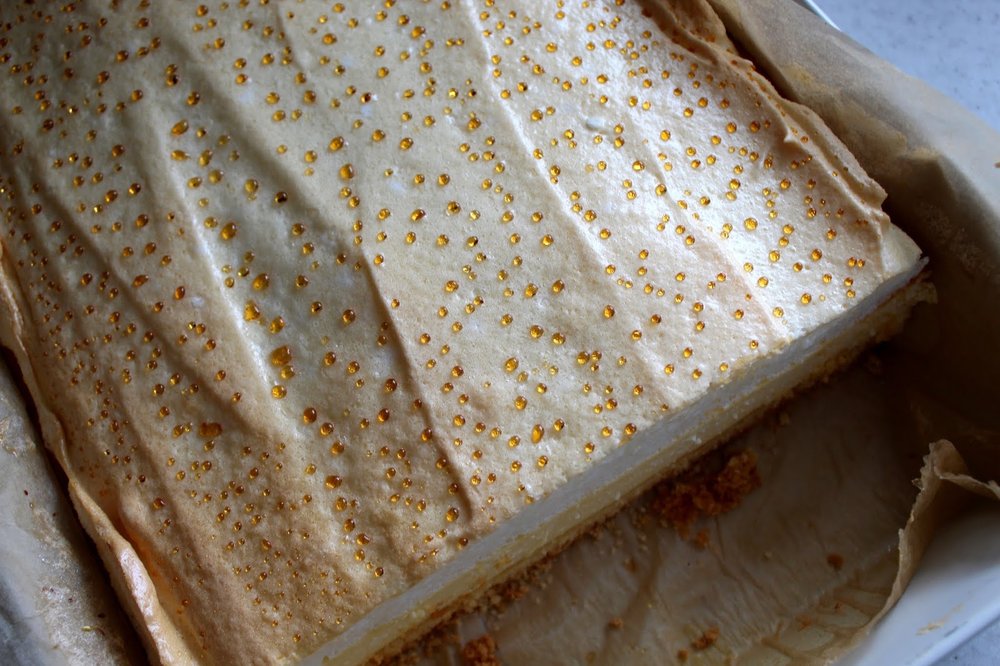 Białka ubić na sztywno z cukrem pudrem. Po 50 minutach wyjąć sernik i nałożyć krem z piany, piec w temperaturze 150°C około 25 minut, do zezłocenia się bezy. Gotowy sernik wyjąć i zostawić do wystudzenia. Krople rosy wychodzą około 1 godziny po upieczeniu.