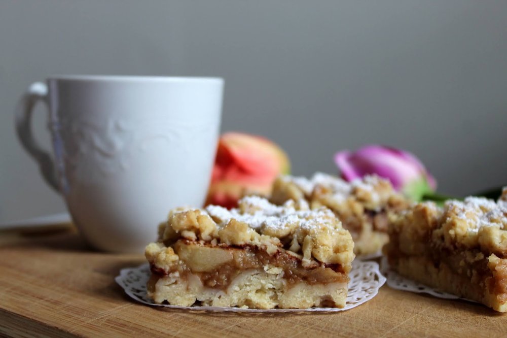Schłodzone ciasto wyjąć i podzielić na dwie równe części. Jedną część zetrzeć na tarce na spód formy (zetrzeć lub „poskubać” palcami), lekko wylepić spód ciastem. Na ciasto wyłożyć jabłka zmieszane z cynamonem (ja dałam około 3 małe łyżeczki), wyrównać. Na wierzch zetrzeć lub „poskubać” pozostałą część ciasta.