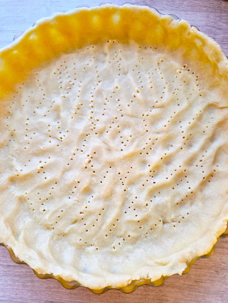 Mąkę i cukier puder wysypać na stolnicę, dodać masło pokrojone w mniejsze nieregularne kawałki, na środku zrobić zagłębienie i dodać jajko. Całość szybko wyrobić w dłoniach do momentu powstania gładkiego ciasta. Lekko spłaszczyć, zawinąć folią spożywczą lub włożyć do woreczka, odłożyć do lodówki na 30 minut. Schłodzonym ciastem wyłożyć dno formy (u mnie forma o średnicy 24 cm), gęsto nakłuć widelcem. Ponownie włożyć do lodówki na 15 minut.
