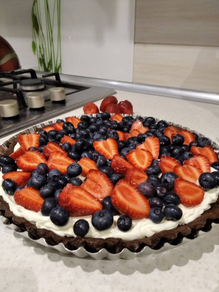 Gotowy krem nakładamy na upieczony i wystudzony spód. Na krem wykładamy umyte i dokładnie wysuszone owoce, na owoce wylewamy tężejącą galaretkę. Całość chowamy do lodówki i czekamy aż galaretka stężeje. Najlepiej schować ciasto na całą noc. Przechowywać w lodówce.