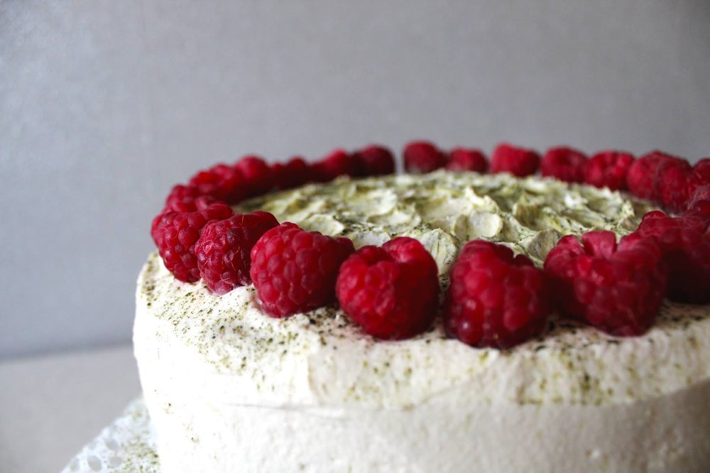Zielony tort z herbatą matcha i malinami. Doskonały na lato, wilgotny, kolorowy z wyczuwalną nutą cytrynową w kremie.