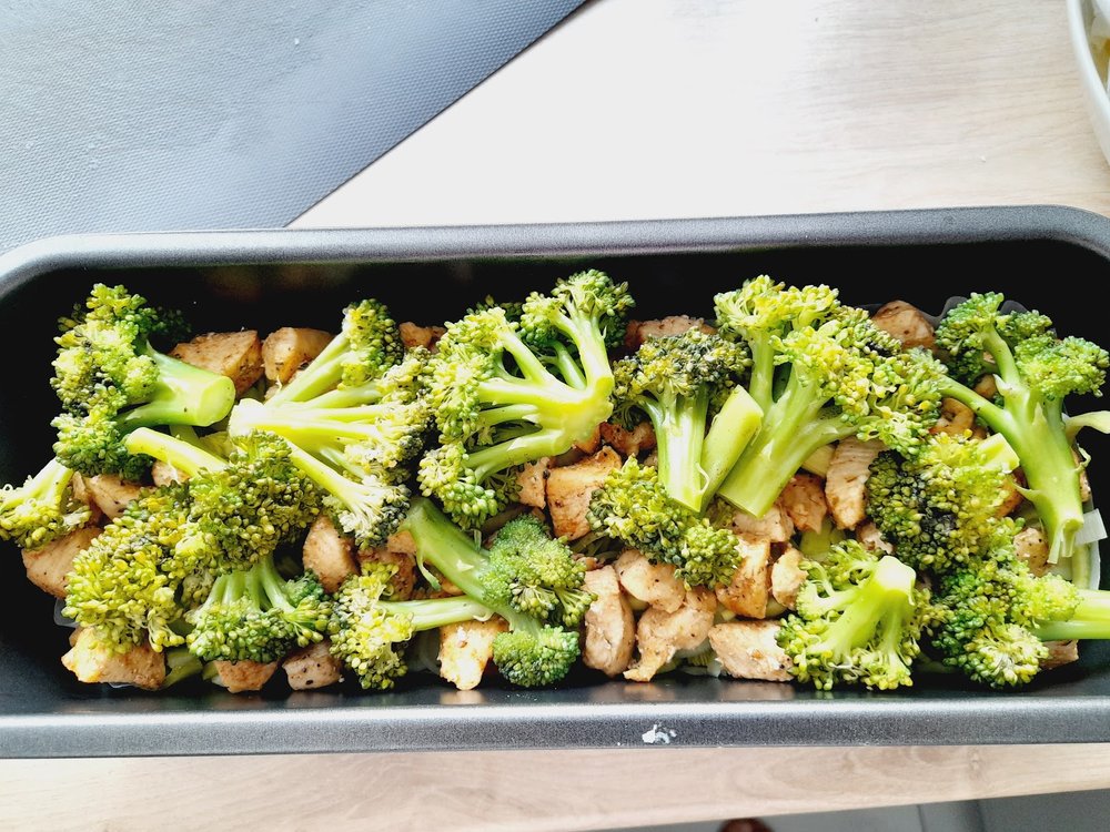 Na spód małego naczynia żaroodpornego lub formy wyłożyć pokrojone w plasterki ziemniaki, następnie pora, kurczaka i brokuły.